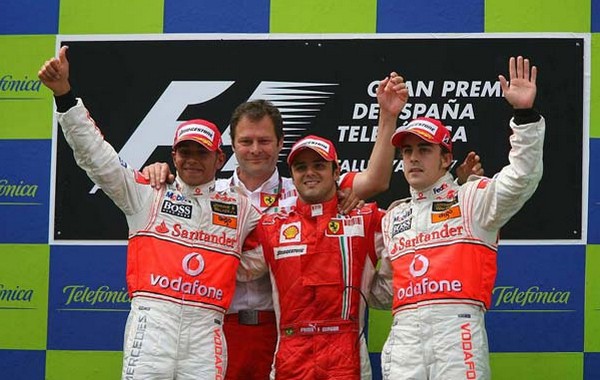- Hamilton (2º), Massa (1º) e Alonso (3º). |