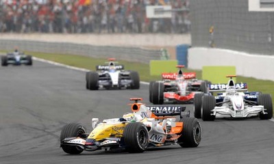 teve que conter o ataque de Robert Kubica (BMW). Foto inferior: Fisichella (Renault), Heidfeld (BMW), Alonso (McLaren) e Nico Rosberg (Williams) disputaram o 5º lugar a prova toda. |