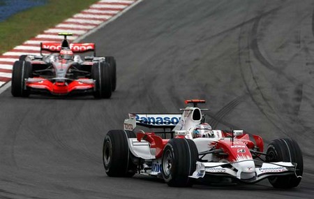JARNO TRULLI ANDOU MUITO BEM A PROVA TODA E QUASE CONQUISTA UM PÓDIO. PERDEU A TERCEIRA POSIÇÃO PARA KOVALAINEN (ATRÁS NA FOTO) NOS PITS. |