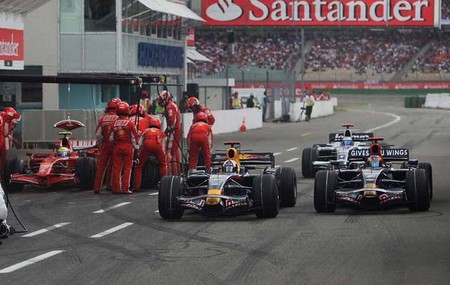 NICK HEIDFELD, DE CAPACETE NOVO, FEZ A MELHOR VOLTA DA PROVA E PAROU PARA UM "SPLASH AND GO". VOLTOU EM 4º E FEZ DE TUDO PARA PASSAR FELIPE MASSA. |