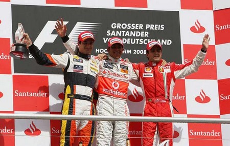 O PÓDIO DA NOVA GERAÇÃO. LEWIS HAMILTON ASSUMIU A LIDERANÇA ISOLADA DO CAMPEONATO. AO SEU LADO OS BRASILEIROS NELSINHO PIQUET E FELIPE MASSA. |