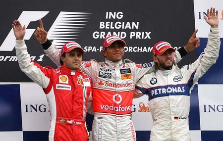 PÓDIO PROVISÓRIO. COM PENALIZAÇÃO DE 25 SEGUNDOS, MASSA VENCEU, HEIDFELD FOI 2º E HAMILTON CAIU PARA 3º. TIMO GLOCK, 8º, TAMBÉM FOI PUNIDO. |