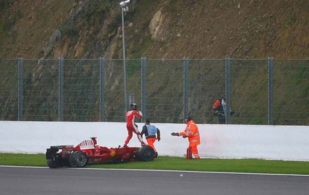 COM A CHUVA RAIKKÖNEN E HAMILTON SAÍRAM DA PISTA VÁRIAS VEZES, MAS NUMA DESSAS SAÍDAS O FINLANDÊS, QUE LIDEROU A PROVA QUASE TODA, BATEU. |