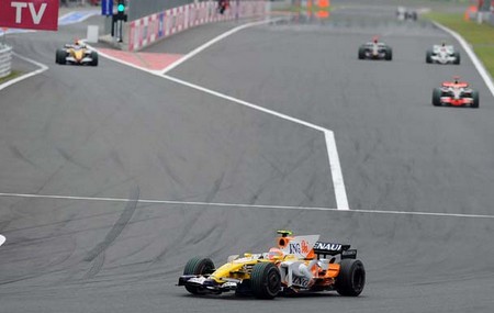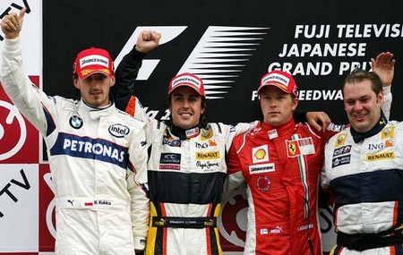 PÓDIO COM FERNANDO ALONSO, NOVAMENTE EM PRIMEIRO, LADEADO POR ROBERT KUBICA (BMW), QUE AINDA DISPUTA O TÍTULO, E KIMI RAIKKÖNEN (FERRARI). |