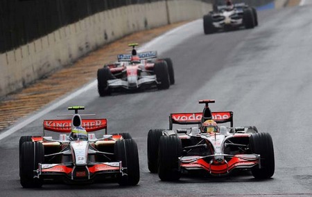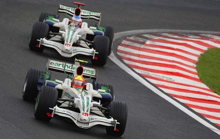 BARRICHELLO (À FRENTE) UTILIZOU O CAPACETE DE INGO HOFFMANN, HOMENAGEANDO O AMIGO QUE ABANDONA AS PISTAS EM 2008. ATRÁS SEGUE JENSON BUTTON |